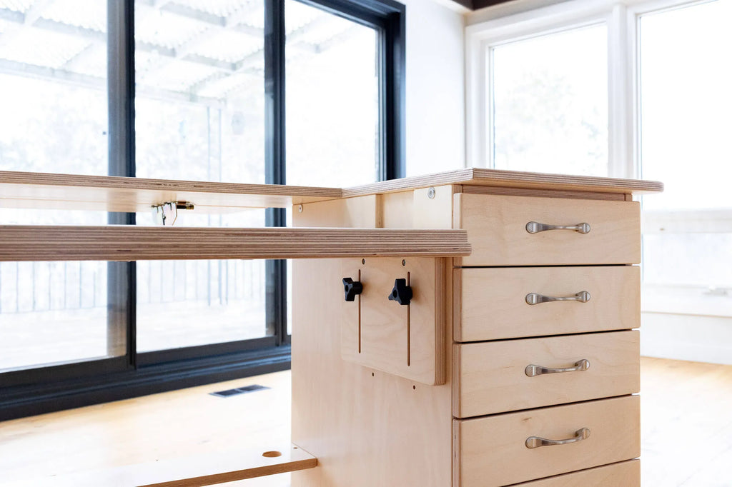 Chest of drawers including: thread and bobbin drawers (1), cutting pull outs, storage drawers with re-arrangeable dividers (3 medium and 1 large).