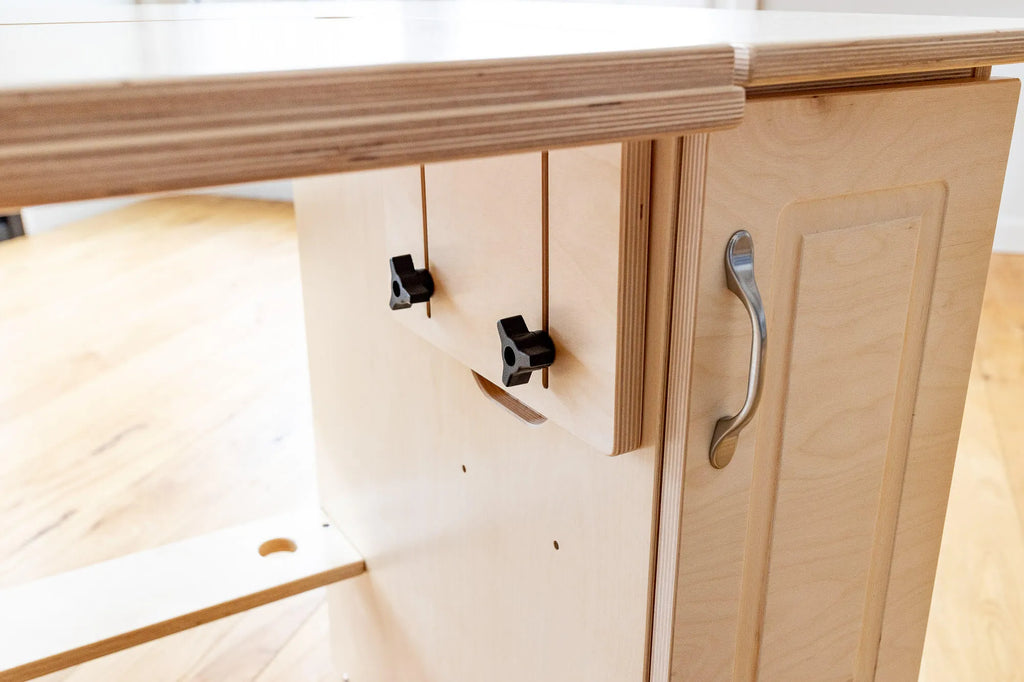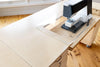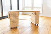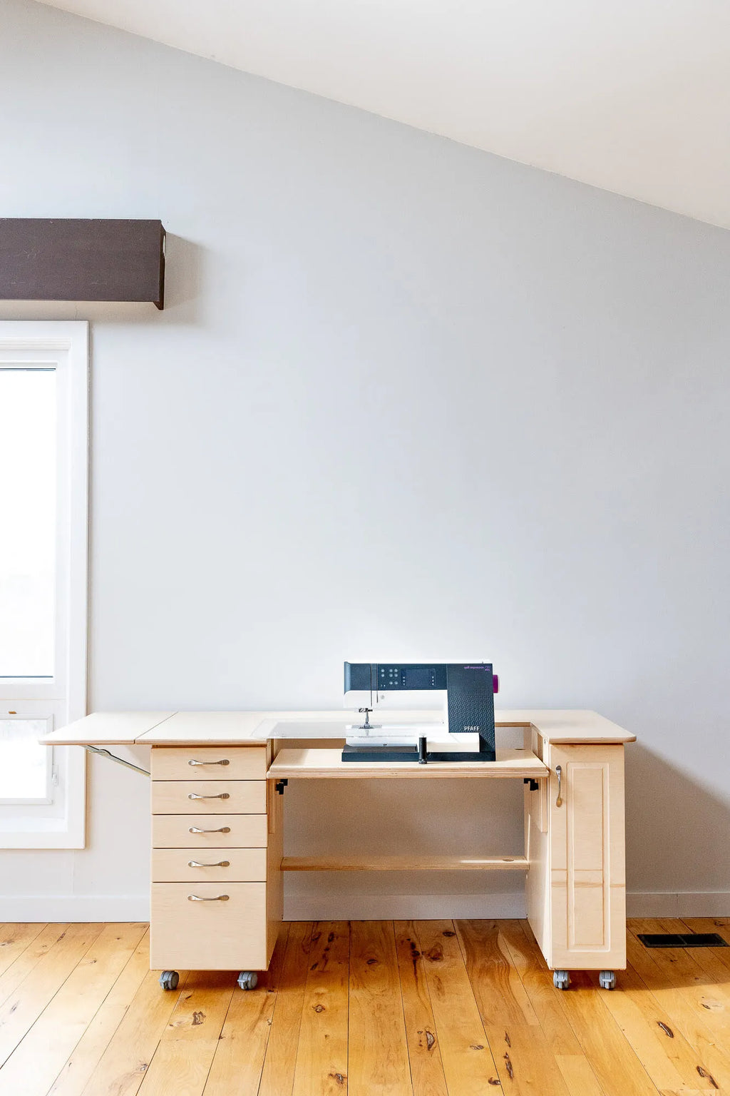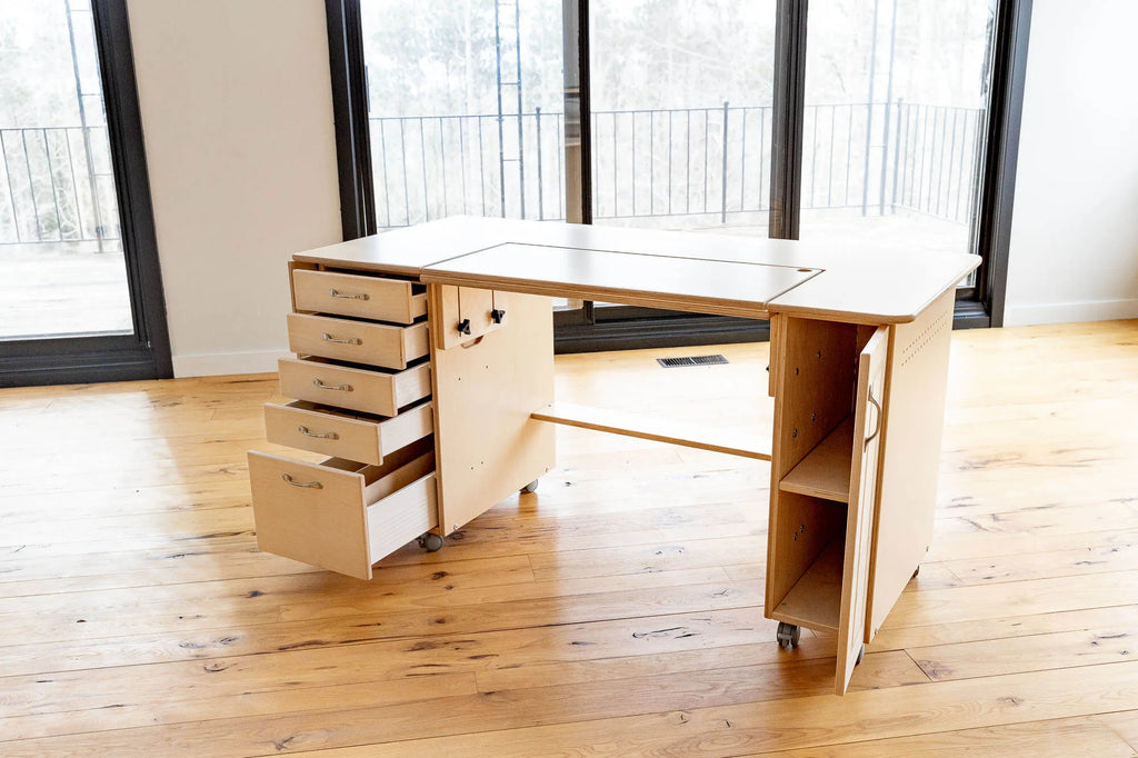 The SEW 6028XL is designed for creators who need ample space and smart organization to keep their workflow smooth and efficient. Featuring Eddycrest's signature bank of drawers on the left side, this model offers optimized storage for your tools, keeping everything you need at your fingertips and neatly organized. On the right side, a spacious cupboard with an adjustable shelf provides flexibility to store larger items such as bins, embroidery hoops, or fabric bolts. With its balance of expansive workspace and thoughtfully designed storage, the SEW 6028XL is perfect for sewists and quilters looking for a complete, functional, and beautifully crafted sewing station.